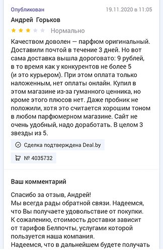 Впервые покупал здесь. Решил купить туалетную воду Boucheron pour homme 50ml. Заказ пришёл почтой через неделю. Сам парфюм стоил 87 рублей, но вместе с доставкой и оплатой наложенного платежа (3%) получилось 96 рублей, что, меня конечно же не порадовало.